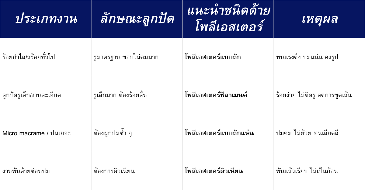 สำหรับงาน micro macrame หรือสายปมเยอะ ๆ ควรให้ความสำคัญกับ “ความคมของปม” และ “การไม่ย้วย” เพราะถ้าเส้นย้วย ลายจะบิดและไม่คม งานจะดูไม่เนี้ยบทั้งที่ฝีมือดี ดังนั้นเส้นถักแน่นมักเหมาะกว่า