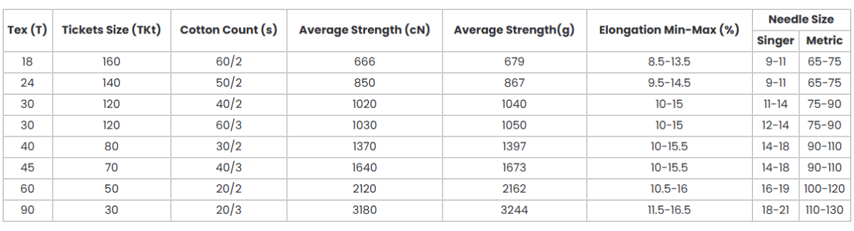 ขนาด/สเปคด้ายเย็บโพลีเอสเตอร์ที่มีจำหน่าย