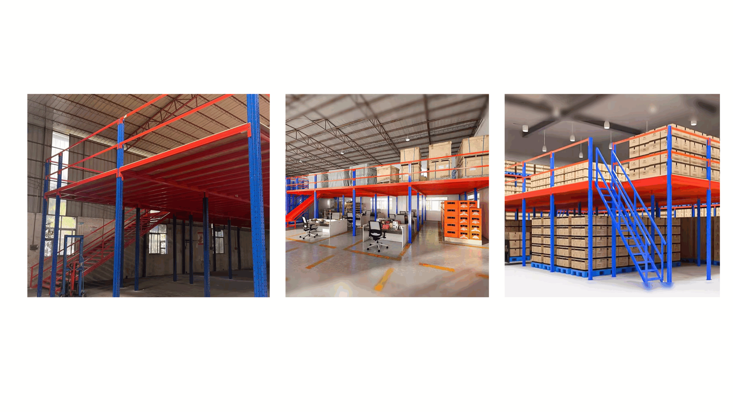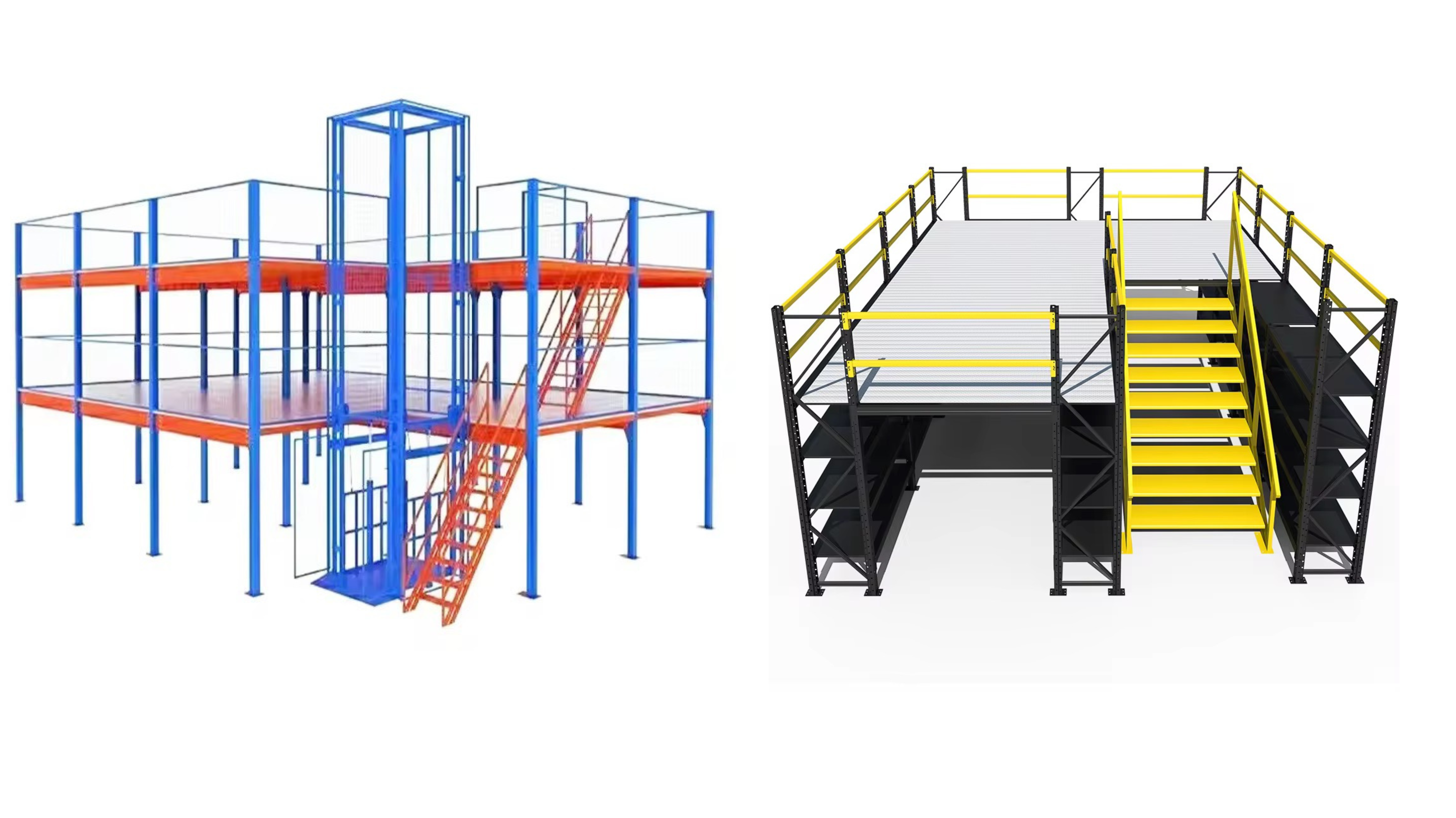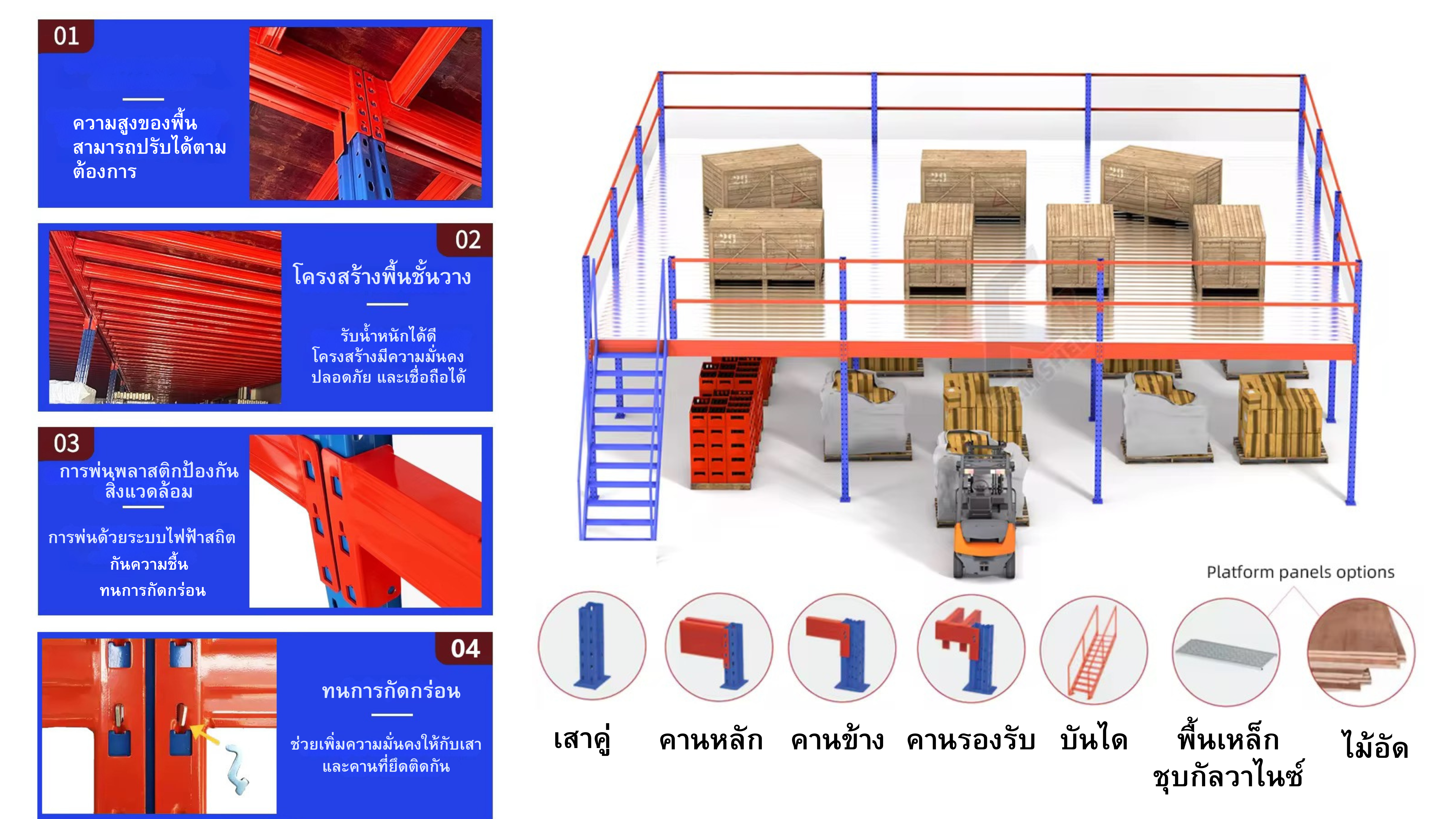 สินค้าชั้นลอย (Mezzanine Floor / ชั้นลอยน็อคดาวน์): ประกอบด้วยส่วนไหนบ้าง + อุปกรณ์เสริม + ตัวเลือกที่เพิ่มฟีเจอร์ได้ เช่น บันได, ราวกันตก, ชั้นวางของด้านล่าง, ระบบลิฟต์, สไลด์สินค้า ฯลฯ