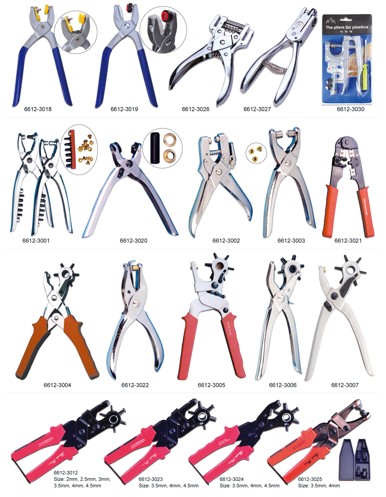คีมประเภทต่าง ๆ ใช้สำหรับการเจาะรูเสริมความแข็งแรง การปั๊มตาไก่ หรือการย้ำกระดุมแป๊ก เหมาะสำหรับงานกระเป๋า เครื่องหนัง หมวก เสื้อผ้าเด็ก ป้ายสินค้า รวมถึงงานตกแต่งต่าง ๆ