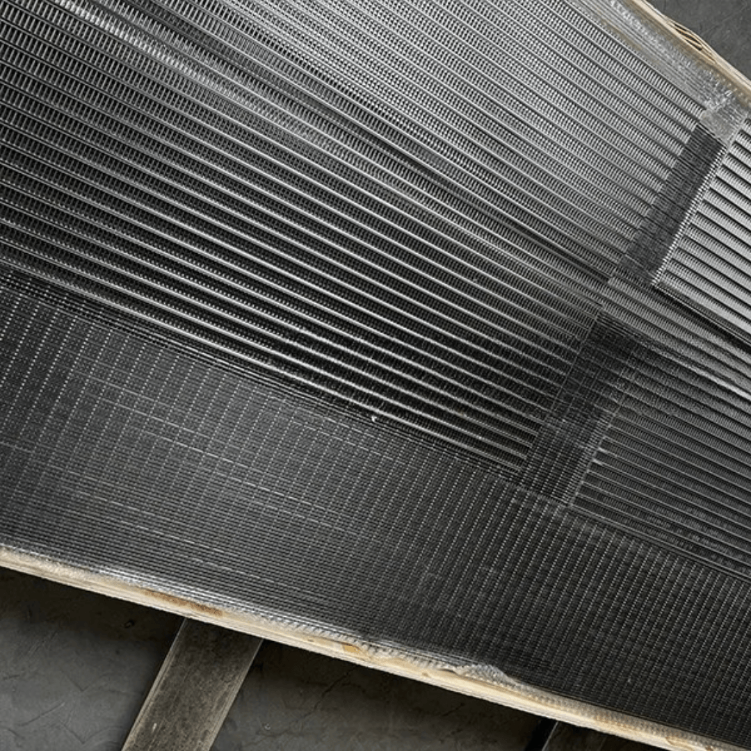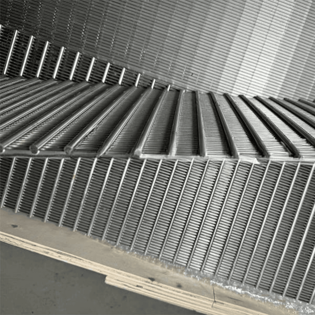 ตะแกรงลวด แบบแผง คือแผงสกรีนรูปทรงสี่เหลี่ยมผืนผ้า ผลิตจาก “ลวดวี” (Wedge Wire หรือ ลวดทรงสามเหลี่ยม) ที่วางระยะห่างเท่ากันเพื่อสร้าง “ช่องสลอต” (Slot Opening) จากนั้นเชื่อมติดกับ “แท่งค้ำ” (Support Rods) เพื่อเพิ่มความแข็งแรงของโครงสร้าง