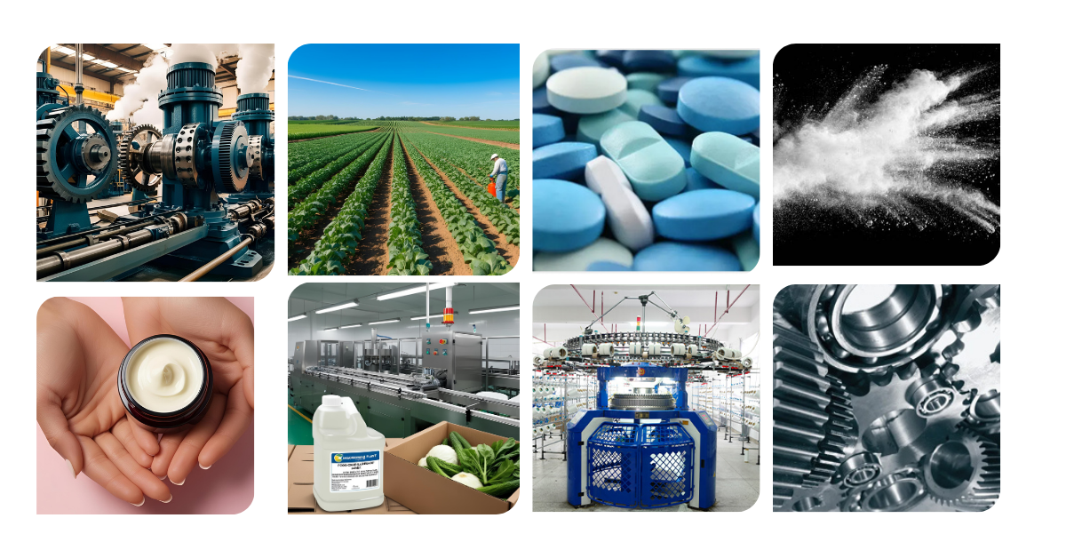อุตสาหกรรมอาหาร (Food Grade), เครื่องสำอาง (Cosmetics), ยา (Pharmaceuticals), สิ่งทอ (Textile), พลาสติก, ยาง และอุตสาหกรรมเคมี