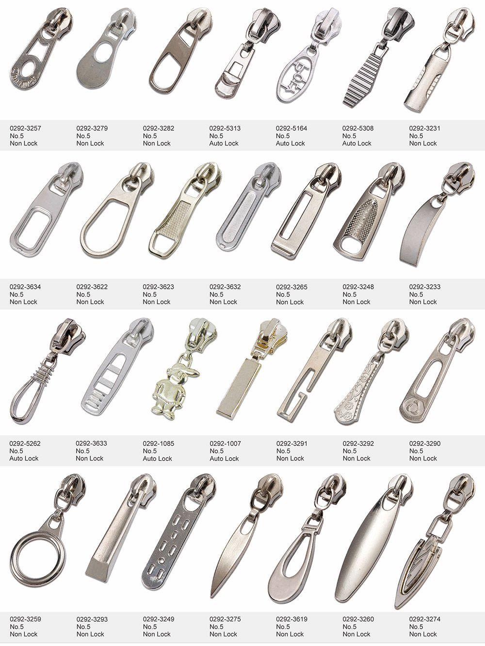 หัวซิป (Zipper Slider) คุณภาพสูง ผลิตจากโลหะ ไนลอน และเรซิน มีให้เลือกทั้งแบบ Auto Lock, Non Lock, Pin Lock, Semi-auto และ Reversible เหมาะกับงานเย็บเสื้อผ้า กระเป๋า รองเท้า และสั่งผลิตแบบ OEM/ODM